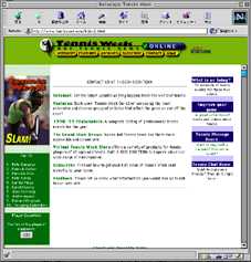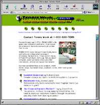 | テニスウィークの紙面版とテレビコマーシャルでは、「テニスウイークは熱心なテニスの視聴者だけを対象としており、テニス界について明確なニュースや写真での報道を主眼としている。テニス界の大事なことについての真面目な読み物です」とうたっている。 元デビスカップ選手のジーン・スコットがこのテニスウィークの創始者であるが、上記の通り、テニスウイークは世界のトップ記事、専門家による権威的記事、そして草分け的な記事に満ちている。そしてこのテニスウイークのウェブサイトには、紙面版のベストが載っており、テニスの玄人、初心者ともに楽しめるものとなっている。 フィーチャー欄の7月16日版には、ウインブルドンのハイライトが載っており、「ギム5」の部でベテラン記者のリチャード・エバンスは、「ピート・サンプラスは特別のチャンピオンであることを示している。というのは、彼のボレーは特別うまいものではなく、今までうまいと思ったこともない」と書いている。 一方、女子選手については、スティーブ・フリンクがヤナ・ノボトナに対して「3度 目の正直」という記事を載せている。 1998年〜99年のプロスケジュール欄には、ATP、WTA、その他の大会の完全な年間スケジュールが載っており、1999年のATPツアーの予定表とともに、過去の優勝者も掲載されている。そして、グレッグ・ルゼドスキーとトニー・ピッカードコーチの激しいけんか別れの記事、シュテフィ・グラフに対するエジプト人のストーカー、記録破りのウインブルドンのウェブサイト等の紹介もそれている。 「世界のテニス界の最新情報をお届けする」と書かれているが、ATPやWTAの記録は5日前のもの。この点は別にして、テニスウィークは第1級の記事をコンスタントに供給しているので、皆さんの必見のサイトの一つに加えるべきと言えるだろう。